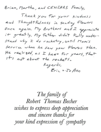 Martha and I sent flowers on behalf of all CENJARS to Eric's late father's visitation/viewing. A very nice Thank You note was received today and I thought that it should be shared with all.